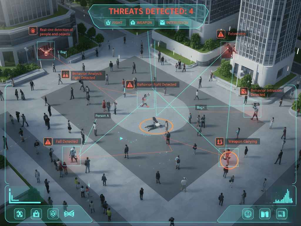 Real-time detection of people and objects, with behavior analysis for threats like intrusions, fights, falls, and weapon carrying