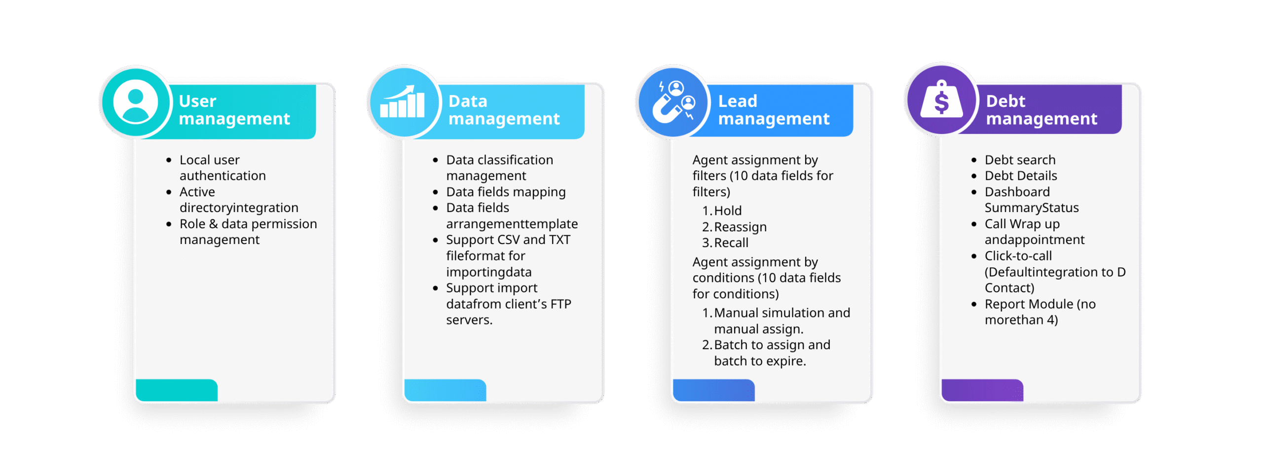 Powered by advanced AI capabilities, D-DEBT intelligently analyzes debtor data and manages leads with precision. Through scoring and strategy management, the system helps your collection teams prioritize cases effectively and apply the most suitable follow-up approach — improving success rates while reducing manual effort.