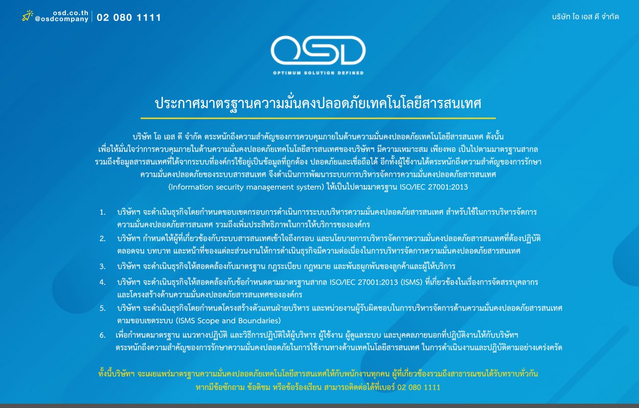 Legal & Compliance ข้อเสนอการเชื่อมต่อโครงข่ายโทรคมนาคม (RIO) ข้อเสนอการใช้โครงข่ายโทรคมนาคม (RAO) ประกาศความเป็นส่วนตัว (Privacy Notice) สำหรับคู่ค้าทางธุรกิจ นโยบายคุกกี้ (Cookie Policy) ประกาศความเป็นส่วนตัว (Privacy notice) เกี่ยวกับการใช้กล้องวงจรปิด (CCTV) ประกาศความเป็นส่วนตัว (Privacy Notice) สำหรับลูกค้า ประกาศนโยบาย สิ่งแวดล้อม ISO 14001 บริษัท โอเอสดี จำกัด เป็นผู้ประกอบกิจการให้บริการด้านเทคโนโลยีสารสนเทศและโทรคมนาคมครบวงจร โดยบริษัทฯมีความมุ่งมั่นตั้งใจที่จะให้บริการที่มีคุณภาพ และเป็นมิตรกับสิ่งแวดล้อม ทางบริษัทจึงได้นำระบบบริหารจัดการด้านสิ่งแวดล้อม (ISO 14001:2015) เข้ามาประยุกต์ใช้ในองค์กรเพื่อสนองตอบความคาดหวังของลูกค้าและผู้มีส่วนได้ส่วนเสียในด้านสิ่งแวดล้อม ประกาศมาตรฐานความมั่นคงปลอดภัยเทคโนโลยีสารสนเทศ ISO 27001 บริษัท โอ เอส ดี จำกัด ตระหนักถึงความสำคัญของการควบคุมภายในด้านความมั่นคงปลอดภัยเทคโนโลยีสารสนเทศ ดังนั้น เพื่อให้มั่นใจว่าการควบคุมภายในด้านความมั่นคงปลอดภัยเทคโนโลยีสารสนเทศของบริษัทฯ มีความเหมาะสม เพียงพอ เป็นไปตามมาตรฐานสากล รวมถึงข้อมูลสารสนเทศที่ได้จากระบบที่องค์กรใช้อยู่เป็นข้อมูลที่ถูกต้อง ปลอดภัยและเชื่อถือได้ อีกทั้งผู้ใช้งานได้ตระหนักถึงความสำคัญ ของการรักษาความมั่นคงปลอดภัยของระบบสารสนเทศ จึงดำเนินการพัฒนาระบบการบริหารจัดการความมั่นคงปลอดภัยสารสนเทศ (Information security management system) ให้เป็นไปตามมาตรฐาน ISO/IEC 27001:2013